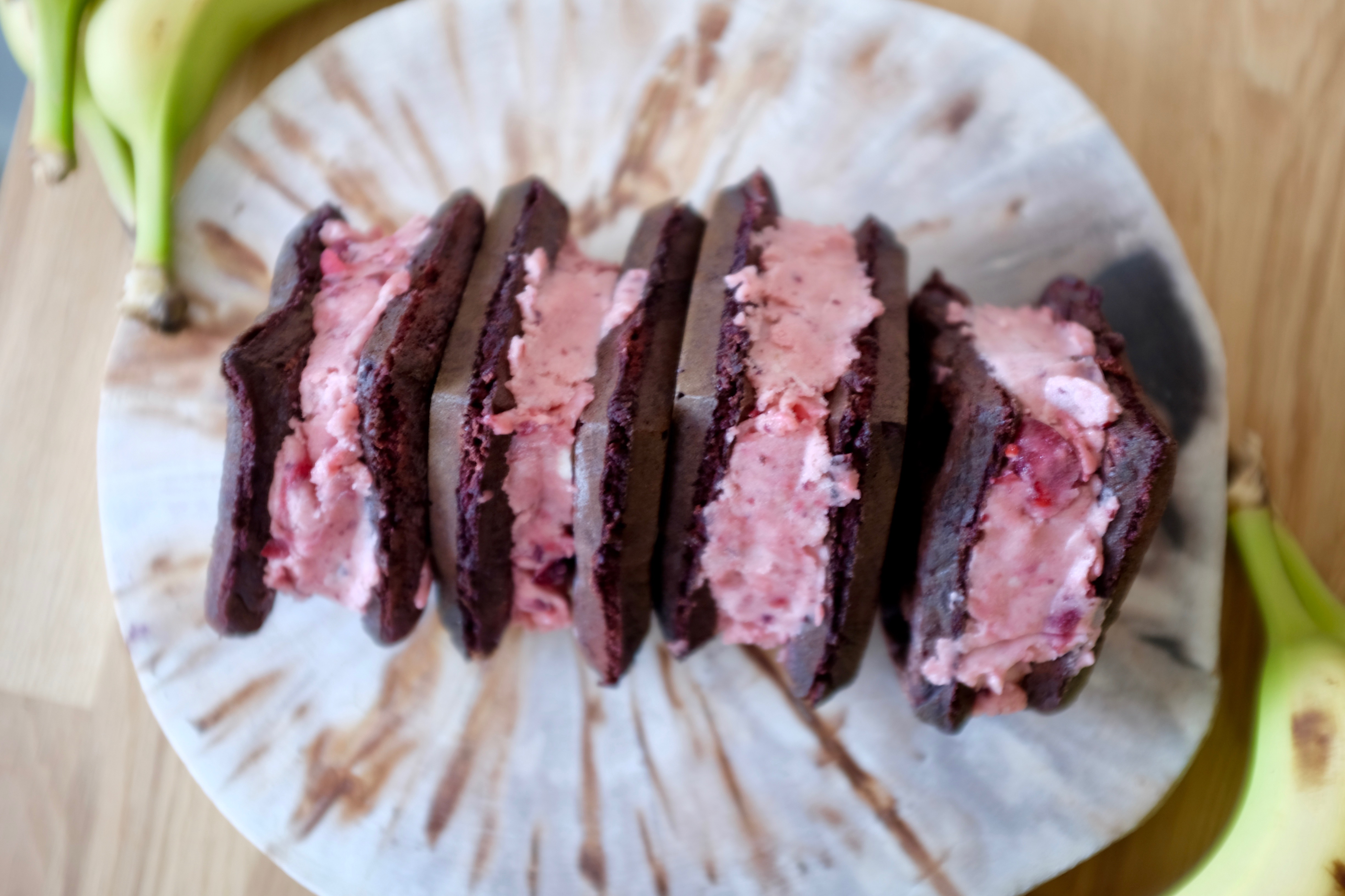 Scoop nice cream onto a waffle portion. Top with another waffle portion and press down gently. You can use a butter knife to smooth out the sides. Repeat with remaining waffle pieces. Freeze the waffle sandwiches at least an hour before enjoying.