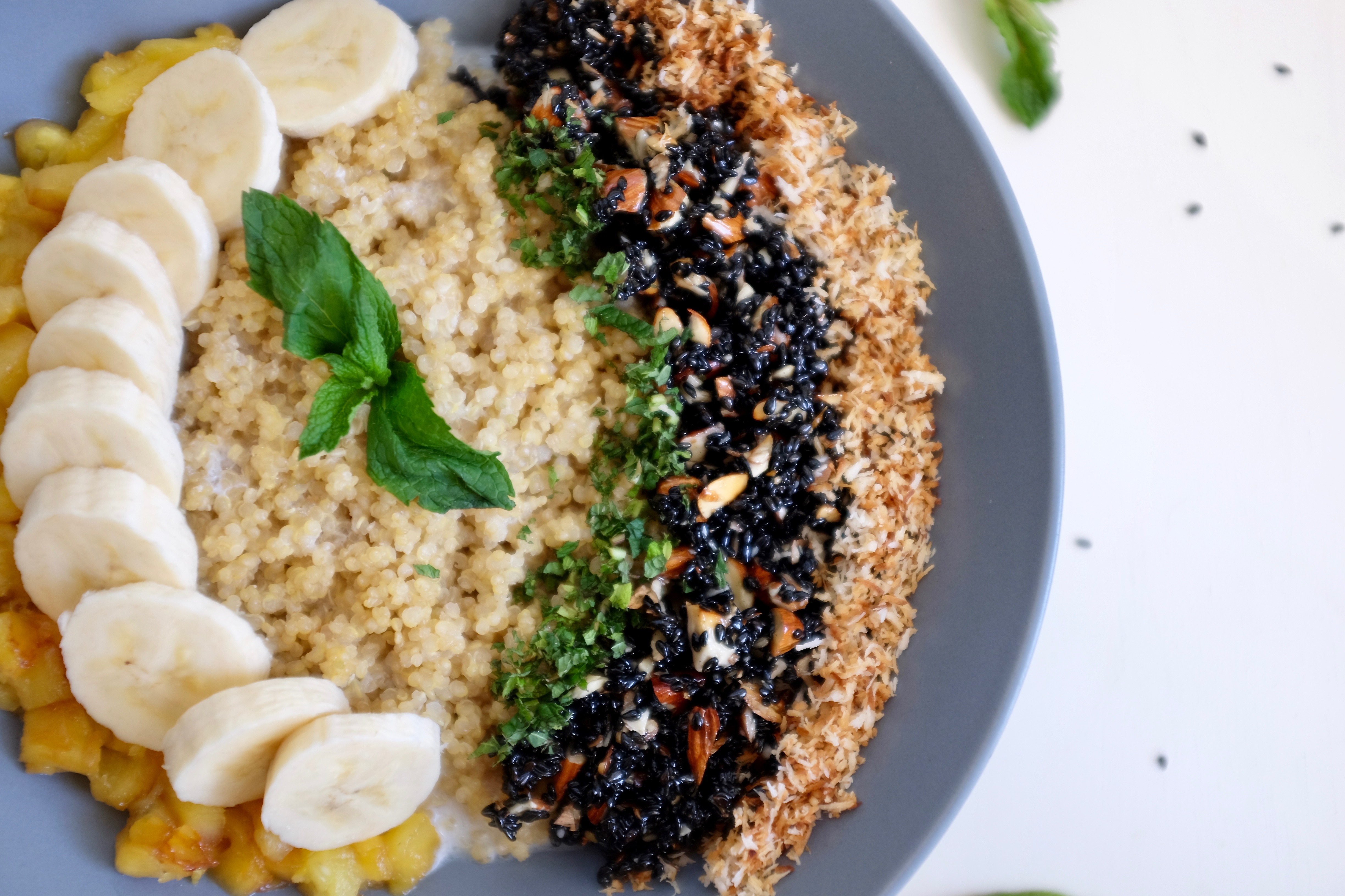 Top each bowl with pineapple, banana, mint, sesame almond brittle, and coconut. Serve warm.